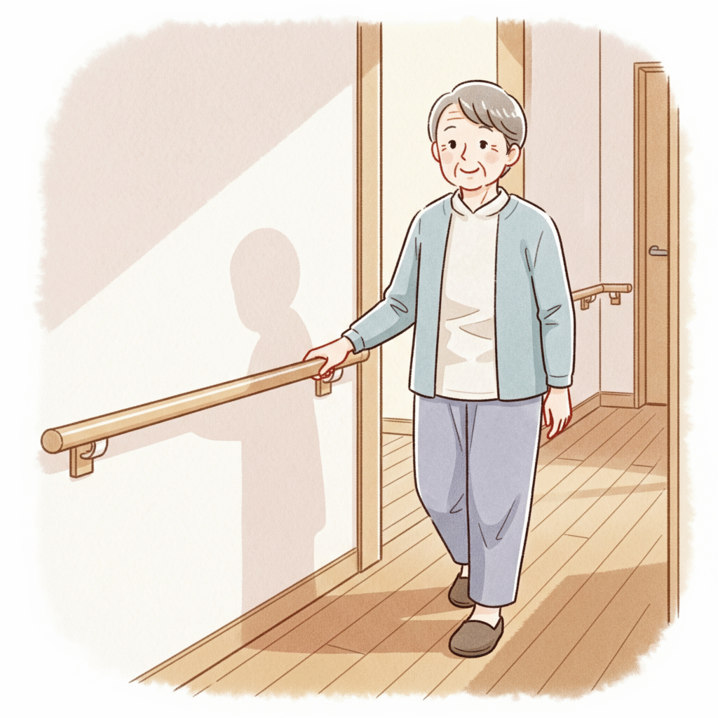 人感センサー付きの照明を設置するなどして、足元をしっかり照らしてあげましょう。 - 手すりをつける 廊下やトイレ、お風呂場に手すりを設置することで、移動時の支えとなります。 転倒のリスクを減らすことができます。