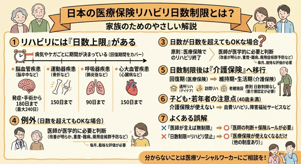 病院の先生が「続けて」と言う一方で、実は日本の医療保険制度には、リハビリを受けられる「日数制限」という厳格なルールがあります。